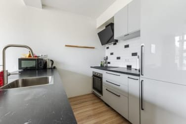 De open keuken staat in directe verbinding met de woonkamer, wat zorgt voor een gezellige en uitnodigende leefruimte. De keuken heeft een moderne uitstraling met strakke lijnen, sfeervolle inbouwspots en een praktische indeling die zowel stijlvol als functioneel is. U vindt hier de nodige inbouwapparatuur, waaronder een inductie kookplaat, een koelkast-vriezercombinatie en een aparte vaatwasser. Dankzij de aanwezige kasten en lades is er voldoende ruimte voor potten, pannen en keukengerei. Koken wordt hier een sociaal moment: terwijl u de maaltijd bereidt, blijft u makkelijk in contact met uw gasten of huisgenoten in de woonkamer. Gezelligheid verzekerd!