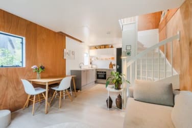De volledige keuken heeft een composiet werkblad, een electrische kookplaat, een oven/magnetron, een vaatwasser en een grote koelkast met vriesvak. In de badkamer is een aparte ruimte voor de wasmachine, en ook verdere kastruimte is beschikbaar, zoals de trapkast en de zwarte rij kasten op de eerste verdieping. Verschillende indelingen zijn mogelijk: zo is het mogelijk om beneden een woonkeuken in te richten, en de zitkamer naar boven te verplaatsen. Ook kan een tweede slaapkamer worden gecreëerd op de eerste verdieping. Daarnaast is daar ook nog ruimte voor een aparte werkplek.