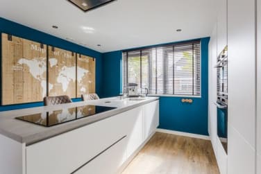 De ruime woonkamer trekt direct de aandacht dankzij een markante houten lattenwand achter de televisie, een sfeervolle brede gashaard en een verborgen bioscoopscherm — alles aanwezig voor het ultieme thuisbioscoop- of gezinsmoment. De open keuken met groot eiland en alle inbouwapparatuur sluit hier naadloos op aan. Via de brede schuifpui stapt u zo de achtertuin in.