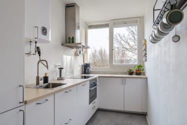 Je komt het appartement binnen in de hal die toegang geeft tot vrijwel alle vertrekken. De lichte woonkamer ligt aan de voorzijde en biedt een prachtig groen uitzicht. Vanuit de woonkamer is het zonnige balkon op het westen bereikbaar, een fijne plek om buiten te zitten en van dit vrije uitzicht te genieten. De slaapkamer aan de voorzijde is bereikbaar vanuit de woonkamer, die ook uitstekend kan dienen als werk- of logeerkamer. De keuken is in 2023 vernieuwd en voorzien van koelkast, vriezer, inductiekookplaat, afzuigkap, oven en vaatwasser. Aan de achterzijde bevindt zich de tweede slaapkamer. De badkamer is in 2020 vernieuwd door de vorige bewoners en beschikt over een inloopdouche, wastafel met meubel en een wasmachineaansluiting. Het toilet is separaat en eveneens vernieuwd.