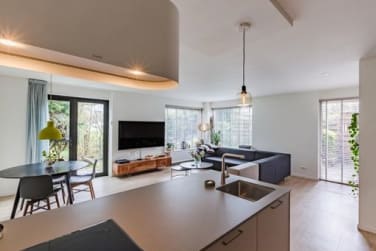 Via de verplaatste voordeur kom je binnen in een sfeervol halletje met handige kastruimte en een modern toilet. Naast de entree ligt een praktische buitenberging. De lichte woonkamer heeft een open keuken voorzien van kookeiland met combi-oven, inductiekookplaat, Wave design afzuigkap, vaatwasser, koelvriescombinatie en ingebouwde koffiemachine. De zwart metalen openslaande deuren (2020) geven toegang tot de zonnige tuin op het zuiden – je geniet hier de hele dag van de zon, terwijl je dankzij de slimme ligging van het terras ook altijd een fijne schaduwplek hebt, zelfs op de warmste dagen.