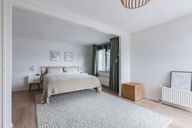 Op de overloop vind je twee slaapkamers en een vernieuwde badkamer met douche, wastafel en toilet. De ruime hoofdslaapkamer is gerealiseerd door twee kamers samen te voegen en kan desgewenst weer eenvoudig teruggebracht worden naar twee aparte slaapkamers, ideaal als je een extra (kinder)kamer of werkkamer wilt creëren.