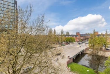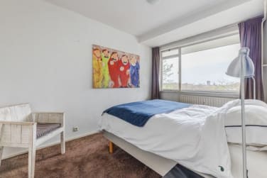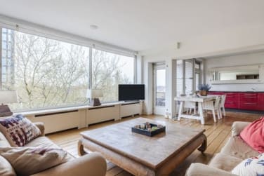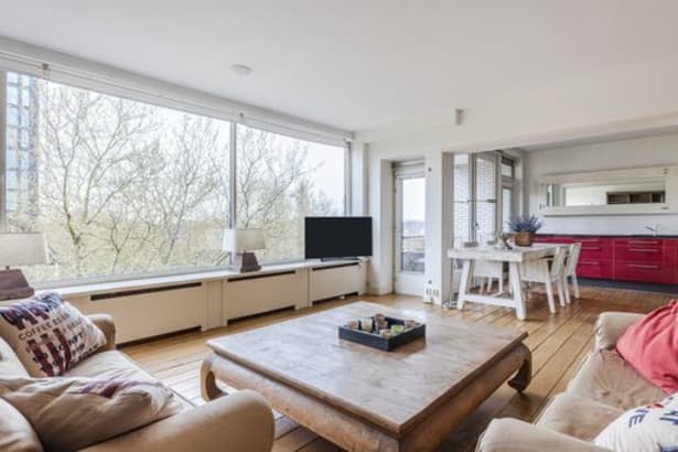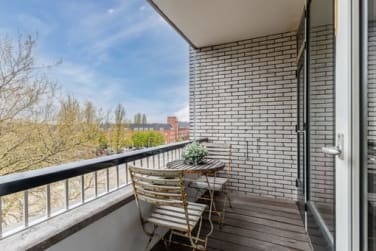 Wie op de vijfde woonlaag aan het stille eind van de galerij de voordeur opent, ziet meteen waarom dit appartement anders is: geen buren die langslopen, een vrij uitzicht over de Parnassusweg en een rustige, lichte woonkamer die de hele middag de zon vangt.