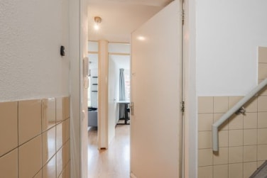 Bij binnenkomst tref je een kleine hal met deuren naar de badkamer (incl toilet), slaapkamer, woonkamer/keuken en de meterkast. De badkamer is voorzien van een douche, wastafel, toilet en wasmachine / droger. De ruime slaapkamer biedt plaats aan een ruim 2-persoonsbed, kledingkasten en een volwaardige werkplek met zit/stabureau.