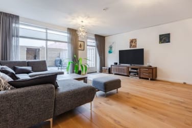 De woonkamer van circa 30 m² is afgewerkt met een hoogwaardige eiken parketvloer. Grote raampartijen zorgen voor veel daglicht en bieden een prachtig zicht op de tuin. De moderne separate leefkeuken in L-opstelling biedt volop werk- en opbergruimte en is dankzij de grote ramen heerlijk licht.