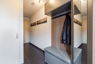 Achter de voordeur bevindt zich een ruime entreehal met moderne garderobe, meterkast, toilet met fonteintje, trap naar de eerste verdieping en toegang tot de royale woonkamer.