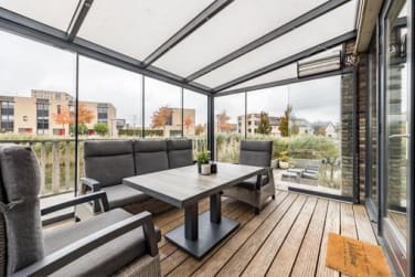- Buiten: waterrand-terras ca. 60,7 m² met serre | dakterras ca. 27,5 m² met serre (ca. 5×4 m) | extra zonneterras ca. 35 m² (zuid)
