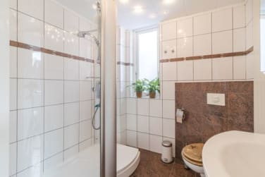 Eerste verdieping: Hier vind je twee ruime kamers en een frisse badkamer met inloopdouche en hangend toilet. De eerste kamer is momenteel een ideale werkkamer; de kastenwand met spiegeldeuren zorgt hier voor een prachtig ruimtelijk effect. De hoofdslaapkamer is een 'master suite' over de volledige breedte (voorheen twee kamers) met een aangrenzende ruimte die perfect dient als inloopkast. Vanwege de bouwaard is er achter het knieschot veel geïsoleerde, droge en op dit moment ongebruikte ruimte beschikbaar voor het opslaan dingen die je niet vaak nodig hebt.