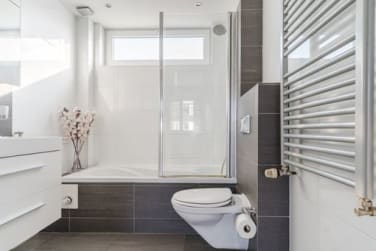 Overloop, drie slaapkamers, aan de achterzijde twee slaapkamers en aan de voorzijde de 3e slaapkamer, met rechte wanden over de gehele eerste verdieping. De drie slaapkamers en de hal zijn voorzien van laminaatvloer. Een moderne badkamer met ligbad en dubbele wastafel en tweede hangend toilet, designradiator en vloerverwarming.