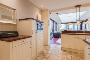 De ruime woonkeuken (ca. 15 m²) is uitgerust met inductiekookplaat, oven-/magnetroncombinatie, vaatwasser, apothekerskasten en een stijlvolle granieten eetbar. Aansluitend bevindt zich een lichte serre (ca. 4 x 6 m) met schuifdeuren, gericht op het zuidoosten.