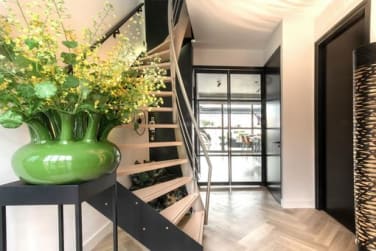 De bijzondere sfeer van deze ruime woning is direct bij binnenkomst voel- en merkbaar. De entree onderscheidt zich met een imposant, 3-meter hoog plafond, designdeuren en een RVS stalen design trap.