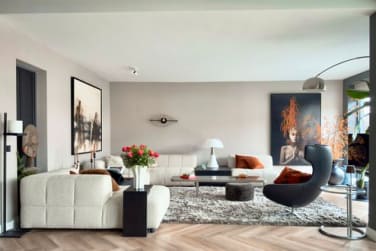 Aan de linkerkant de riante woonkamer in zand /beige tinten, met visgraat pvc-vloer, elektrische vouwgordijnen in zand kleur .Deze harmonieuze sfeer zet zich voort op het terras van 25 m2, voorzien van een kantelbaar lamellen dak. Deze overkapping creëert extra een gevoel van outdoor living en met het openen van de 3-delige schuifpui vergroot je dat zomers nog meer.