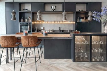 Bij binnenkomst trekt aan de rechterkant van de living een moderne exclusieve maatwerk keuken met kookeiland en bar de aandacht. Voorzien van inbouwapparatuur als Neff stoomoven, Quooker ,Bora-inductieplaat, koelvriescombinatie en Miele vaatwasser .