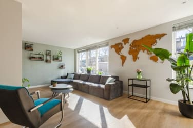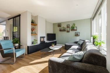 Aan de achterkant zit een gezellige eetkamer met openslaande deuren naar de tuin. De open keuken grenst aan de eetkamer en is voorzien van een moderne keuken met composiet werkblad. De keuken beschikt verder over diverse inbouwapparatuur zoals een vaatwasser, koel/vriescombinatie, kokend waterkraan, combi-oven en inductiekookplaat met ingebouwde afzuiging. Leuke details zijn de koffiecorner en het barretje.