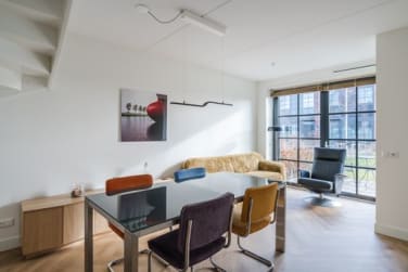 Ruime, lichte leefruimte over de volledige breedte van de woning. Dankzij de grote raampartijen is dit een bijzonder aangename verblijfsruimte. Op de overloop bevindt zich de badkamer met douche, wastafel en toilet.