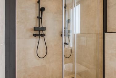 De badkamer ademt comfort en luxe, met een dubbele inloopdouche, een stijlvol badkamermeubel met dubbele wastafel en een tweede toilet. Een heerlijke ruimte om de dag ontspannen te beginnen of af te sluiten.