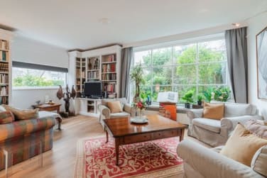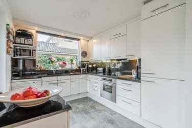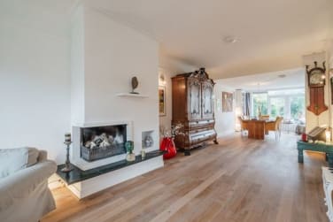 Ruime, lichte L-vormige en uitgebouwde woonkamer met open (gas)haard en openslaande deuren naar de achtertuin. Prachtige white-washed eiken vloer. In de erker aan de achterkant ligt een open keuken, voorzien van een elektrische kookplaat en inbouwapparatuur. De keuken is van het merk Poggenpohl, het aanrechtblad van graniet.