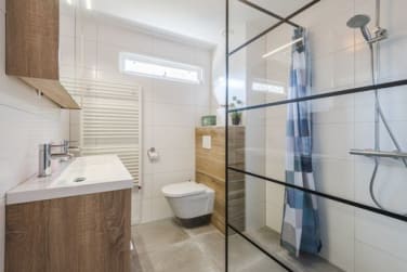 De badkamer (2020) is modern afgewerkt met tegels, een inloopdouche, een wastafelmeubel en een 2e toilet. Er is een raam aanwezig dat geopend kan worden voor natuurlijke ventilatie.