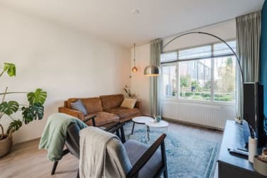 De woonkamer is sfeervol en strak afgewerkt met een laminaatvloer. De ruimte is licht met aan drie zijden ramen en prettig ingedeeld.