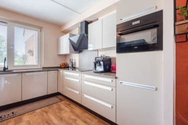 Vanuit de woonkamer loopt u door naar de halfopen keuken aan de voorzijde van de woning. De keuken is uitgevoerd in een praktische L-opstelling en voorzien van een taupekleurig keukenblok met composiet aanrechtblad. Dankzij de diepe laden en kastruimte beschikt u over volop bergruimte.