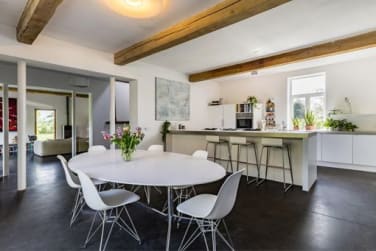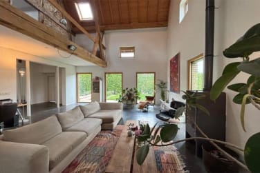 De rechtervleugel van deze carréboerderij (bouwjaar ca. 1780) biedt ca. 292?m² woonruimte. De ruime open keuken vormt het centrale punt van de woning en is uitgerust met Gaggenau-gaskookplaten, Bosch vaatwasser en Liebherr (wijn)koelkasten. De aangrenzende living heeft vier openslaande deuren naar de tuin en zicht op de achterliggende weides. Hoogtes, zichtlijnen en een houtkachel van Dik Geurts bepalen de sfeer.