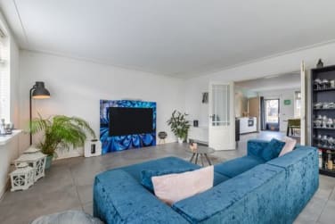 Via de openslaande tussendeuren komt u in de woonkamer. Deze is opvallend ruim opgezet en profiteert van grote raampartijen waardoor het zonlicht rijkelijk naar binnen valt. Er is volop ruimte voor een royale zithoek om heerlijk te ontspannen.