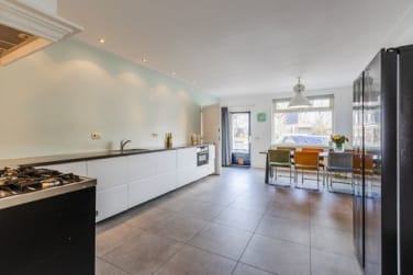 De keuken is zeer ruim met een werkblad van 5 meter met vaatwasser, combimagnetron en een 5 pits Lofra gasfornuis met dubbele oven. Er is ruimte voor een Amerikaanse koelkast en er is voldoende plek voor een grote eettafel, waardoor het echt het hart van het huis vormt. Vanuit de keuken is er direct toegang tot de veranda en zicht op de Oude Rijn met de langsvarende bootjes, wat koken en tafelen extra bijzonder maakt.
