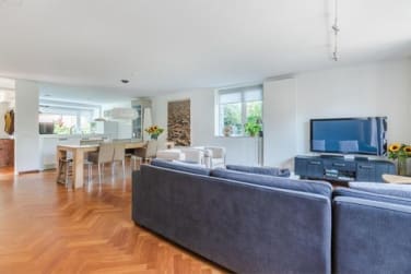 - Keuken, woonkamer en hal met bilinga massief tapis parketvloer