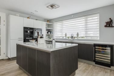 De woonkamer staat in open verbinding met de keuken, het kloppend hart van het huis. Deze beschikt over een groot kookeiland afgewerkt met fraaie composiet werkbladen en keramische kastjes. Het kookplezier kent hier geen grenzen dankzij de professionele apparatuur onder andere van Miele: een koel-/vrieskast, vaatwasmachine, oven & stoom-oven/magnetron, een warmhoudlade, een ruime inductiekookplaat van Bora met geïntegreerd afzuigsysteem, een quooker voor direct kokend water en een wijnklimaatkast om uw wijnen op perfecte serveertemperatuur te bewaren. De grote raampartijen rondom geven uitzicht op de voortuin en zorgen voor een overvloed aan daglicht, terwijl de open indeling de keuken en woonkamer naadloos met elkaar verbindt. In de erker is ruimte voor een grote eettafel.De gehele begane grond vloer is voorzien van vloerverwarming, inclusief de garage.