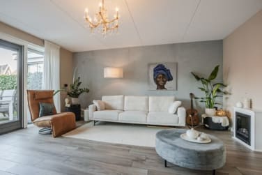 De woonkamer heeft twee openslaande tuindeuren naar de achtertuin. Door de vele ramen is er sprake van veel licht. Hier is ook een groot elektrisch zonnescherm.