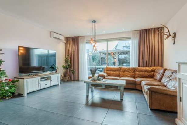 De gehele begane grond beschikt over vloerverwarming, een mooie antracieten tegelvloer en een airco (3,5 kW) die zowel kan koelen als verwarmen; ideaal voor elk seizoen.