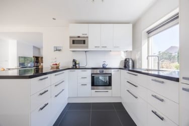 De woonkamer met open keuken is licht en ruim opgezet en vormt het centrale leefgedeelte van de woning. De moderne keuken is voorzien van diverse inbouwapparatuur, waaronder een vaatwasser, koel-vriescombinatie, magnetron, oven, keramische kookplaat en een inbouwafzuigkap.