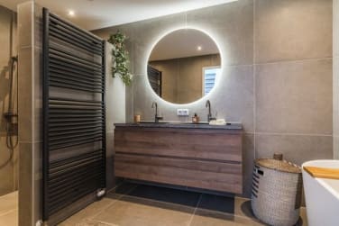 Pluspunten van de woning zijn de energiezuinigheid dankzij de zestien zonnepanelen en het wooncomfort dat wordt gebracht door de vijf airco's in de woning en de UV-warmteplaat boven de bank.