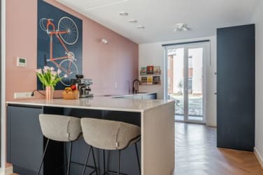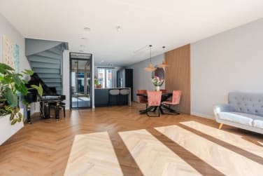 De lichte woonkamer verrast direct door de royale uitbouw (2,40 m) en de grote glazen ramen met openslaande deuren naar de tuin. De pvc-visgraatvloer en vloerverwarming zorgen voor een warme, stijlvolle basis.