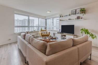 Bij binnenkomst in het appartement ziet u door een grote glazen deur de ruime en lichte woonkamer met uitzicht op de skyline, wat u een levendig stadsgevoel geeft. De grote ramen en het puntdak bieden een extra mooi uitzicht. Hier bevindt zich ook de open keuken en eethoek. De keuken is uitgerust met hoogwaardige apparatuur: een keramische kookplaat met vier pitten, een dubbeldeurs koel-vriescombinatie, een combi-oven met magnetron, een wijnkoelkast en een ruime spoelbak. Het grote kookeiland biedt extra werkbladruimte. De keuken is voorzien van veel moderne opbergruimte. Grenzend aan de keuken bevindt zich een ruime, afgesloten was-/bergruimte. Hier staan ??de wasmachine en de warmte terugwinningsinstallatie.