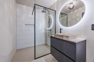 De luxe badkamer is modern afgewerkt en voorzien van een inloopdouche, wastafelmeubel en hoogwaardige materialen.