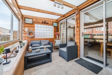 De uitgebouwde woonkamer is heerlijk ruim en licht, met voldoende ruimte voor een comfortabele zit- en eethoek. Via de schuifpui heb je direct toegang tot de dichte houten overkapping: een fijne, lichte plek waar je het hele jaar door kunt genieten.