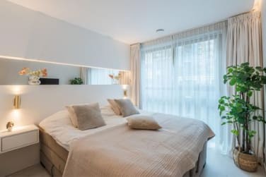 De lichte en sfeervolle woonkamer (ca. 8,3 x 5,1 m) imponeert met grote raampartijen over de volledige breedte en twee sets dubbele openslaande deuren naar Franse balkons. Het interieur combineert elegantie met comfort: fraaie Italiaanse plavuizen met vloerverwarming, strak gestuukte wanden met verfijnde sierlijsten en een stijlvol stucplafond voorzien van sfeervolle inbouwspots. Het royale formaat en het harmonieuze, neutrale kleurenpalet creëren een oase van rust en tijdloze klasse.