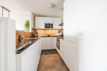 De semi-open keuken staat in prettige verbinding met de woonkamer, ideaal tijdens het koken en voor contact met gasten of familie. De keuken is voorzien van een vaatwasser, oven, magnetron, 5 pits inductiekookplaat en een koel-vriescombinatie. Daarnaast beschik je over voldoende kastruimte voor al je keukengerei en servies. Grenzend aan de keuken bevindt zich ook een inbouwkast die ideaal is om als voorraadkast te gebruiken.