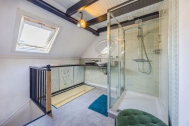 Spacious landing with a newly installed shower room with underfloor heating (2.77 x 3.71 m), featuring a shower cabin, washbasin, and Velux roof window. This is also where the loft ladder to the attic is located. Through a sliding door, you enter the main bedroom (2.90 x 3.52 m), fitted with two new hardwood window frames with HR+ glass.