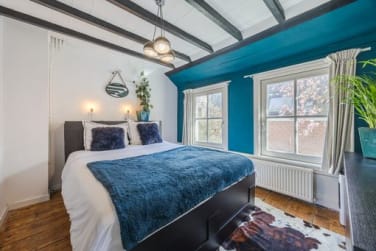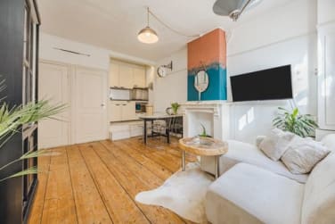 Entrance through the open gate to the courtyard; this is the third house. Charming green front garden with a covered, heated seating area. Entrance to the house via a vestibule, modern toilet with washbasin, living/dining room (3.75 x 4.92 m) with original insulated wooden floor and fireplace, adjoining open kitchen with marble countertop (1.07 x 1.84 m), slightly elevated, equipped with a 4-burner gas stove, flat-screen extractor hood, and combination oven. The glass ceiling provides natural daylight in the kitchen. A door leads to a pantry/wine cellar.