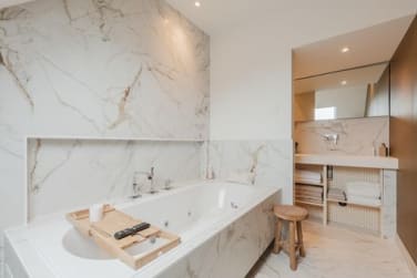 Luxe, vergrote badkamer (2023) met jacuzzi, inloopdouche, wastafelmeubel en Velux-dakraam.