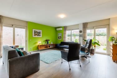 De woonkamer is ruim met veel licht. Twee schuifdeuren brengen je buiten. Op het terras zit je de hele dag heerlijk. De tuin was het lievelingsplekje van de vorige eigenaar en dat zie je in het voorjaar en de zomer.
