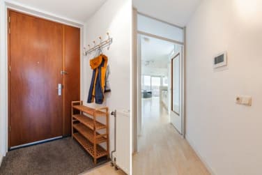 De woonkamer bevindt zich aan de achterzijde en biedt via de schuifpui toegang tot het balkon op het zuidoosten. Hier geniet je van veel lichtinval en een weids uitzicht over Utrecht.