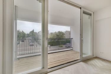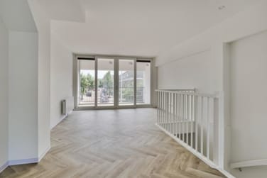 De lichtrijke woonverdieping voelt ruim en modern aan. Aan de achterzijde bevindt zich een open woonkeuken met een strak keukenblok en inbouwapparatuur. De voorzijde is ingericht als gezellige woonkamer, met een industriële glazen pui die toegang geeft tot het zonnige balkon op het zuiden.