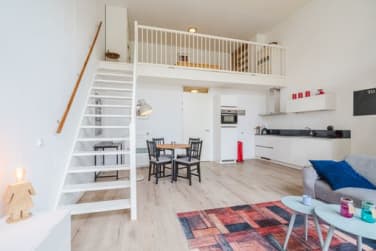 An open staircase leads to the cleverly designed sleeping mezzanine with ample room for a double bed, lots of storage space and, if desired, a small desk to work at, making optimal use of the property’s height and keeping the entire ground floor available as a generous living space.