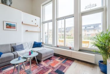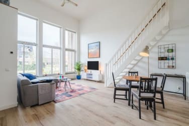 Bij binnenkomst valt meteen de indrukwekkende plafondhoogte van maar liefst 4,84 meter op. Het woongedeelte voelt hierdoor open, luchtig en bijna loftachtig. De grote raampartijen aan de voorzijde laten het daglicht rijkelijk binnenstromen en geven de woonkamer een warme, uitnodigende sfeer.