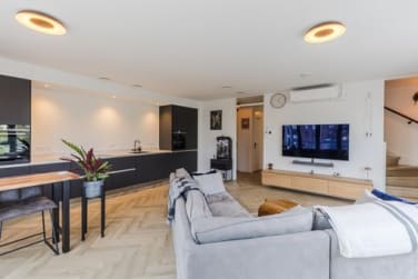 The third floor features a bright living area with wide windows, double French doors with a transparent Juliet balcony and additional doors opening onto the main balcony. The custom-made open kitchen is fitted with high-end appliances, including an induction cooktop with integrated extractor, built-in coffee machine and Quooker instant boiling-water tap. The elegant herringbone PVC flooring with underfloor heating continues seamlessly throughout. From the living room you enjoy views of the Zaan; the master bedroom and walk-in closet (or second bedroom) overlook the skyline of Zaandam. The luxurious bathroom offers a walk-in shower, double washbasin and infrared sauna.
