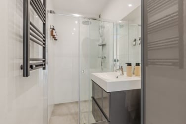 De badkamer is verzorgd afgewerkt en voorzien van een douche en wastafelmeubel. Het toilet is separaat.