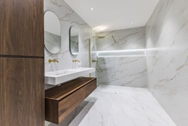 De trendy badkamer met fraaie marmeren tegels ligt centraal in het appartement. De grote badkamer is voorzien van een dubbele wastafel met onderliggend een fraai houten meubel, gouden kranen en 2 spiegels. De inloopdouche heeft een zeer fraaie gouden regendouche.